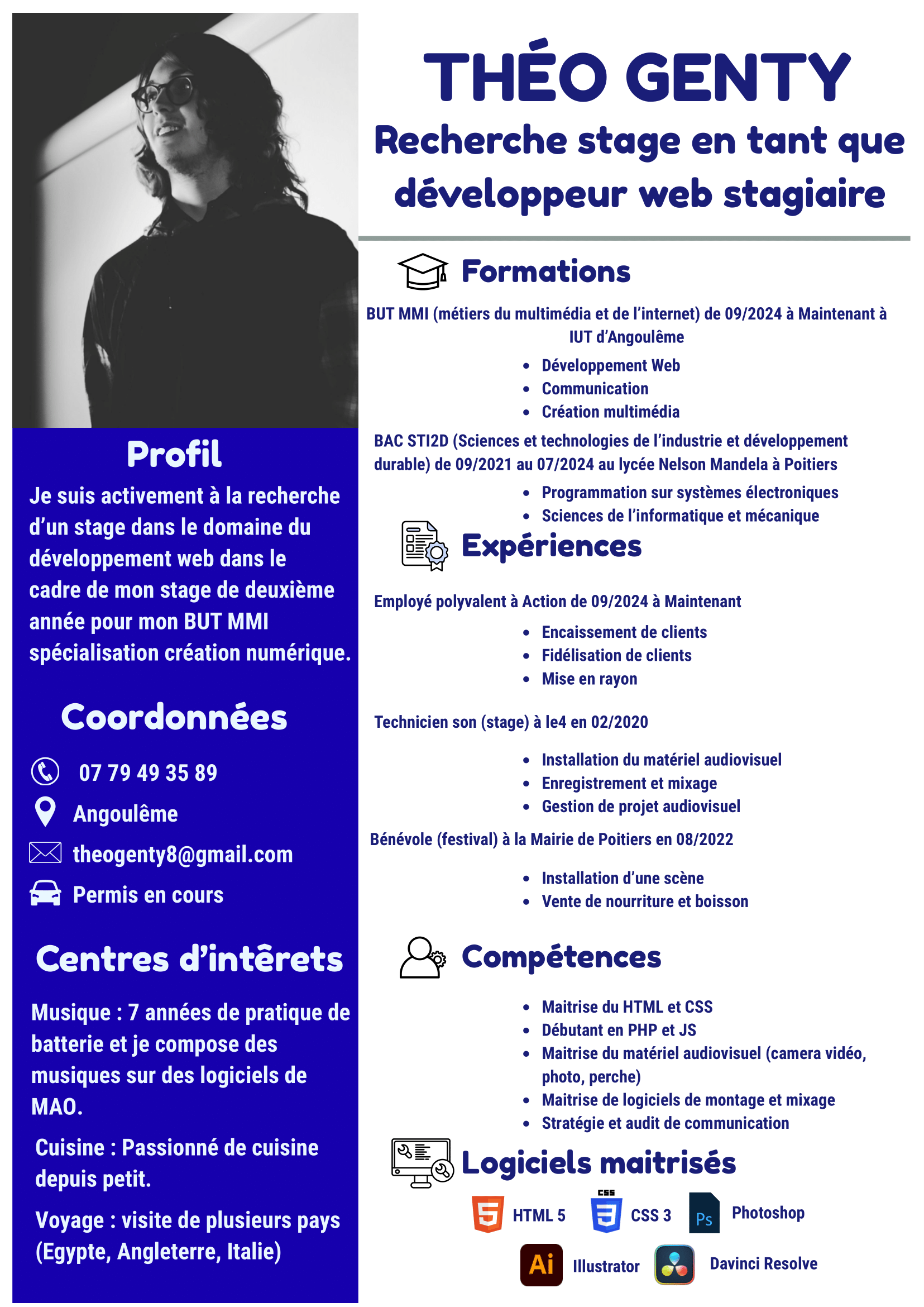 Je m'appelle GENTY Théo, j'ai 19 ans, et je suis actuellement en 2ème année de BUT MMI à Angoulême, spécialisation création numérique. Passionné par le digital et la création, j’aime explorer différentes formes d’expression artistique et donner vie à mes idées grâce aux outils numériques.